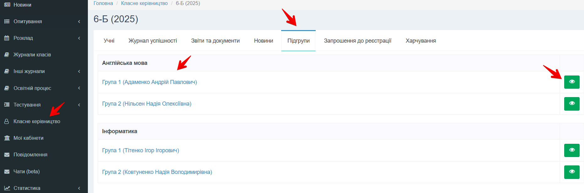 1. Перейдіть у розділ “Класне керівництво” → “Підгрупи” та оберіть потрібну підгрупу, натиснувши на її назву або на зелену іконку «Око».