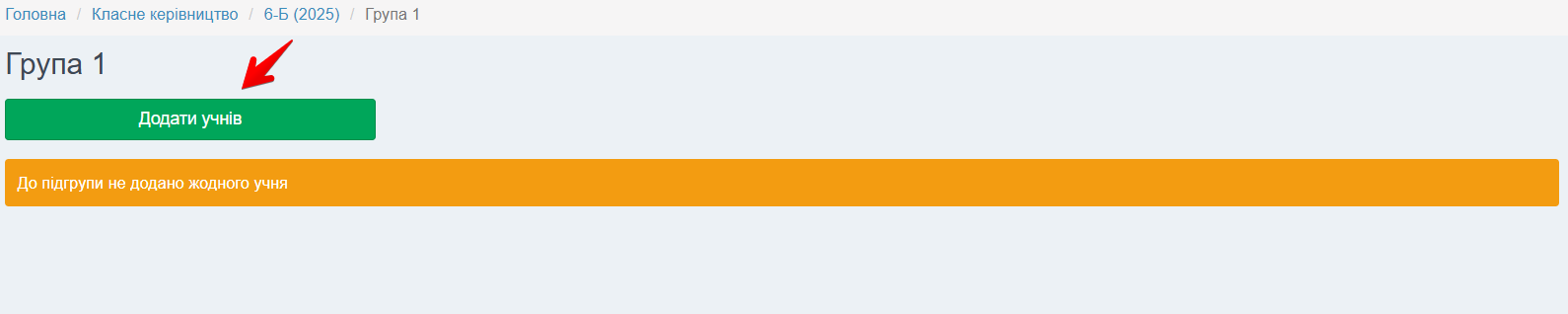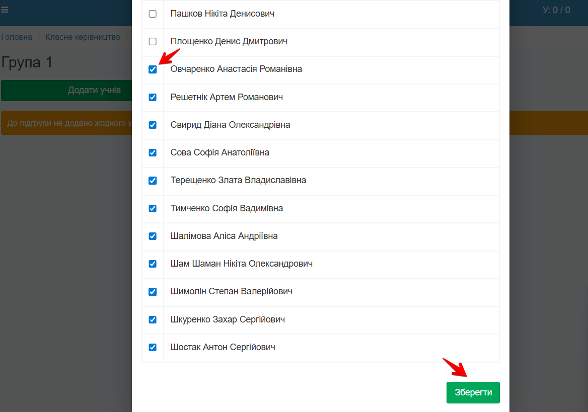 2. Натисніть кнопку “Додати учнів”. Поставте галочки біля учнів, які входять до цієї підгрупи, та натисніть кнопку “Зберегти”.