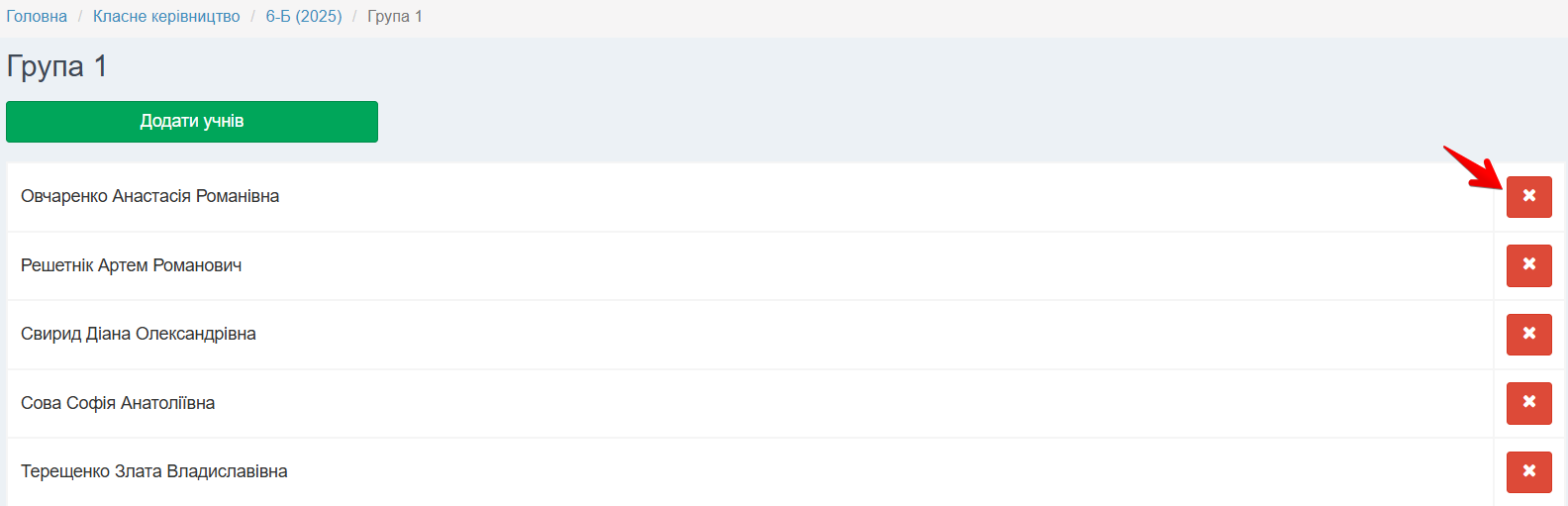 4. Натиснувши на хрестик, можна видалити учня з підгрупи. Ця кнопка буде активною лише доти, доки в учня немає оцінок. Після появи оцінок видаляти учнів із підгрупи неможливо, оскільки разом із цим зникнуть і їхні оцінки. Якщо потрібно перевести учня в іншу підгрупу – зверніться до адміністратора.