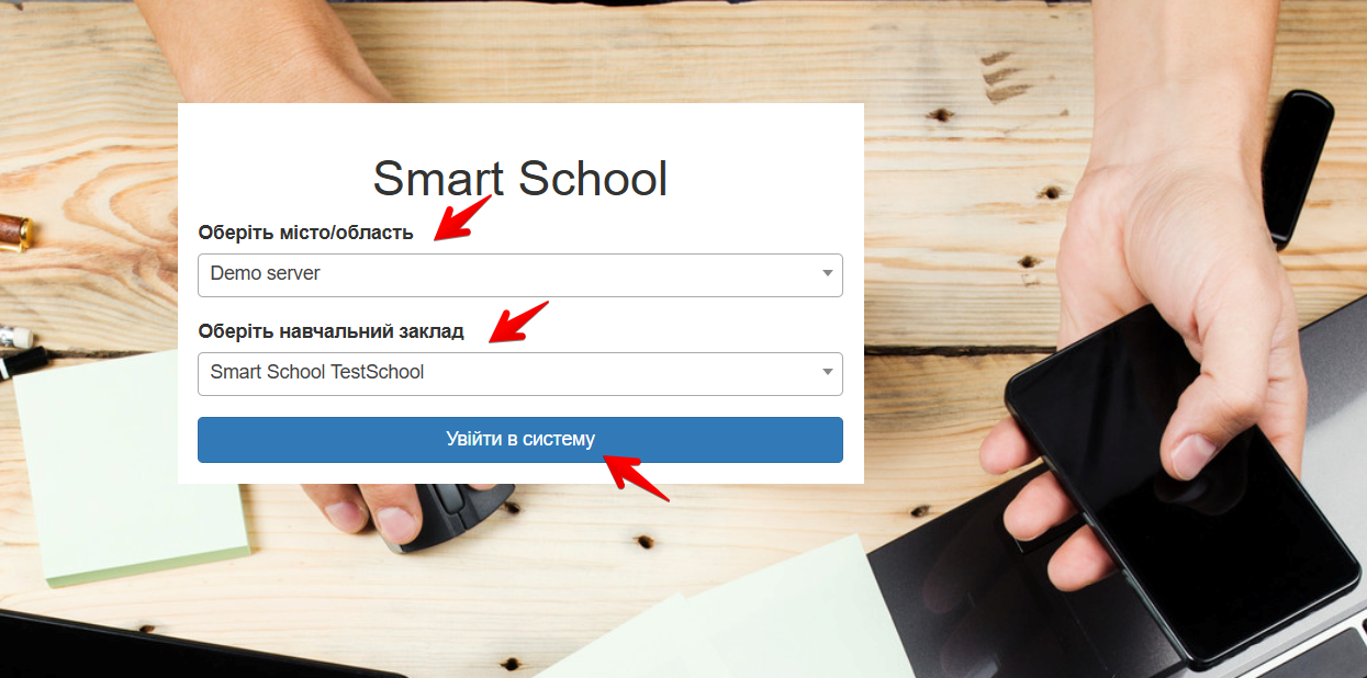 1. Перейдіть за посиланням https://admin.smart-school.com.ua/ та оберіть місто/область і навчальний заклад. Натисніть “Увійти в систему”.