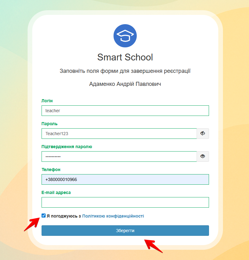 Перейшовши за посиланням вчитель має вказати логін та пароль, поставити галочку “Я погоджуюсь з політикою конфіденційності” та натиснути “Зареєструвати”. Телефон та E-mail вказується за бажанням.