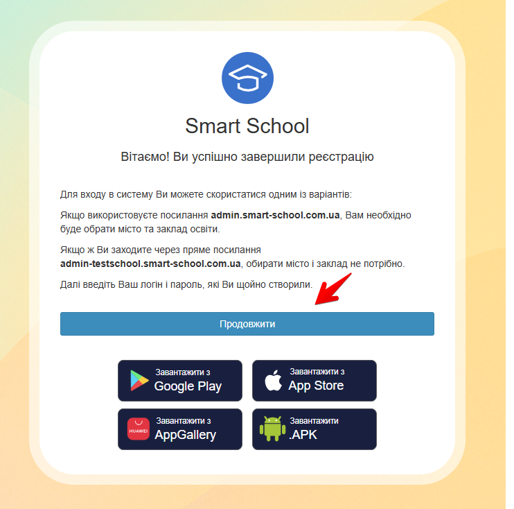5. Ви успішно зареєструвалися. Натисніть “Продовжити” для входу в систему. Тепер для входу використовуйте свій логін і пароль. Збережіть їх, щоб завжди мати доступ до облікового запису.