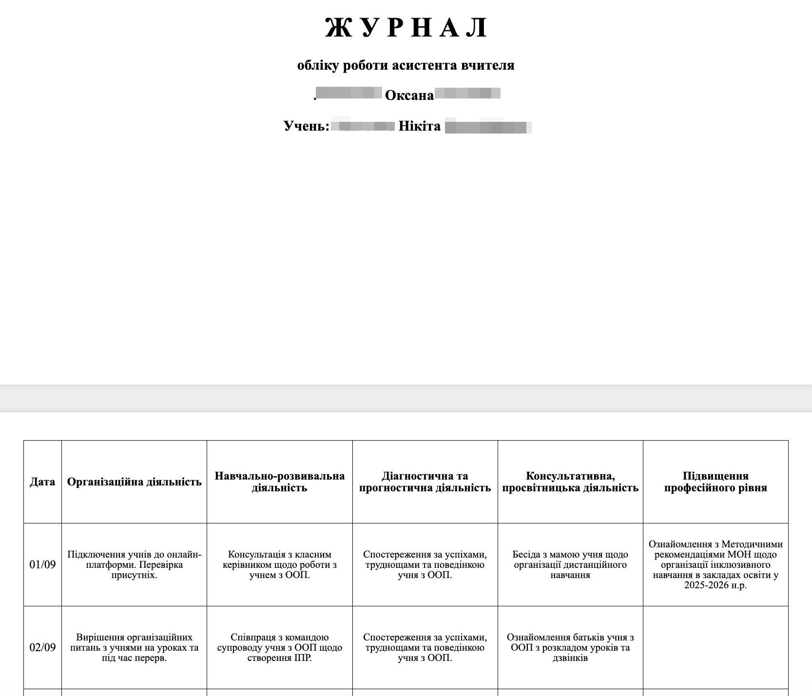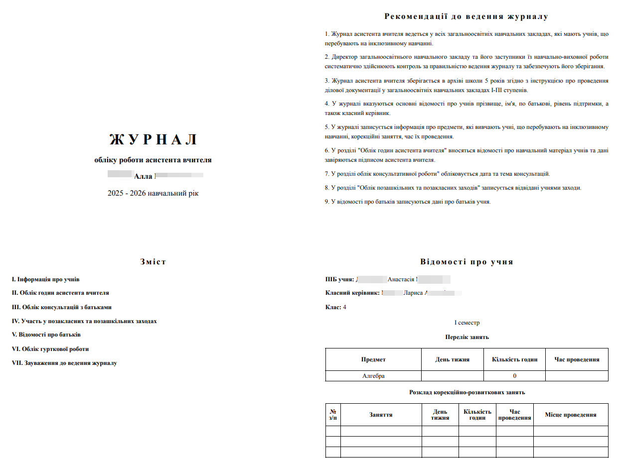 Журнал обліку роботи асистента вчителя використовується для фіксації всіх видів діяльності, які виконує асистент упродовж навчального дня.
