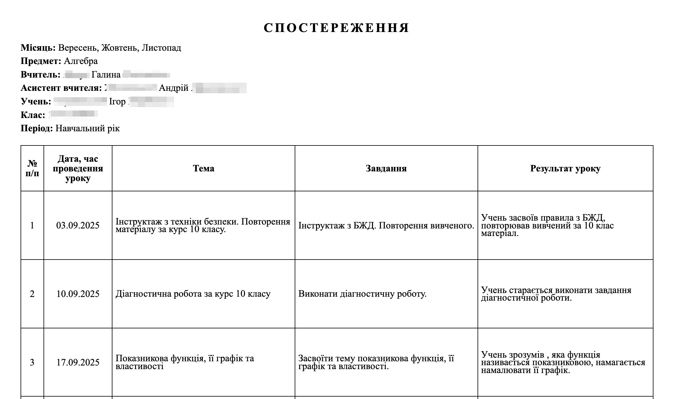 Для ефективної організації роботи асистента вчителя в системі реалізовано функціонал для ведення відповідної документації.