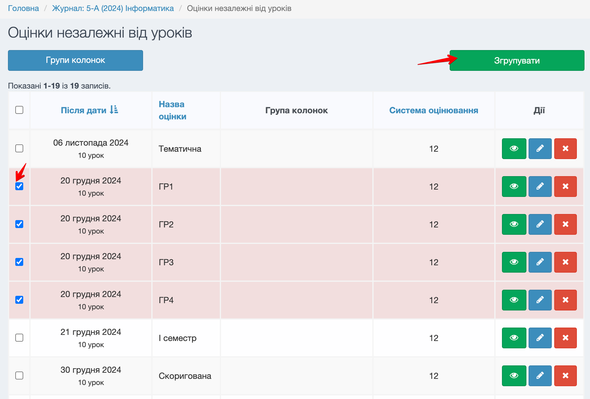 Галочками відмітьте назви колонок, які потрібно об’єднати, і натисніть кнопку “Згрупувати”.